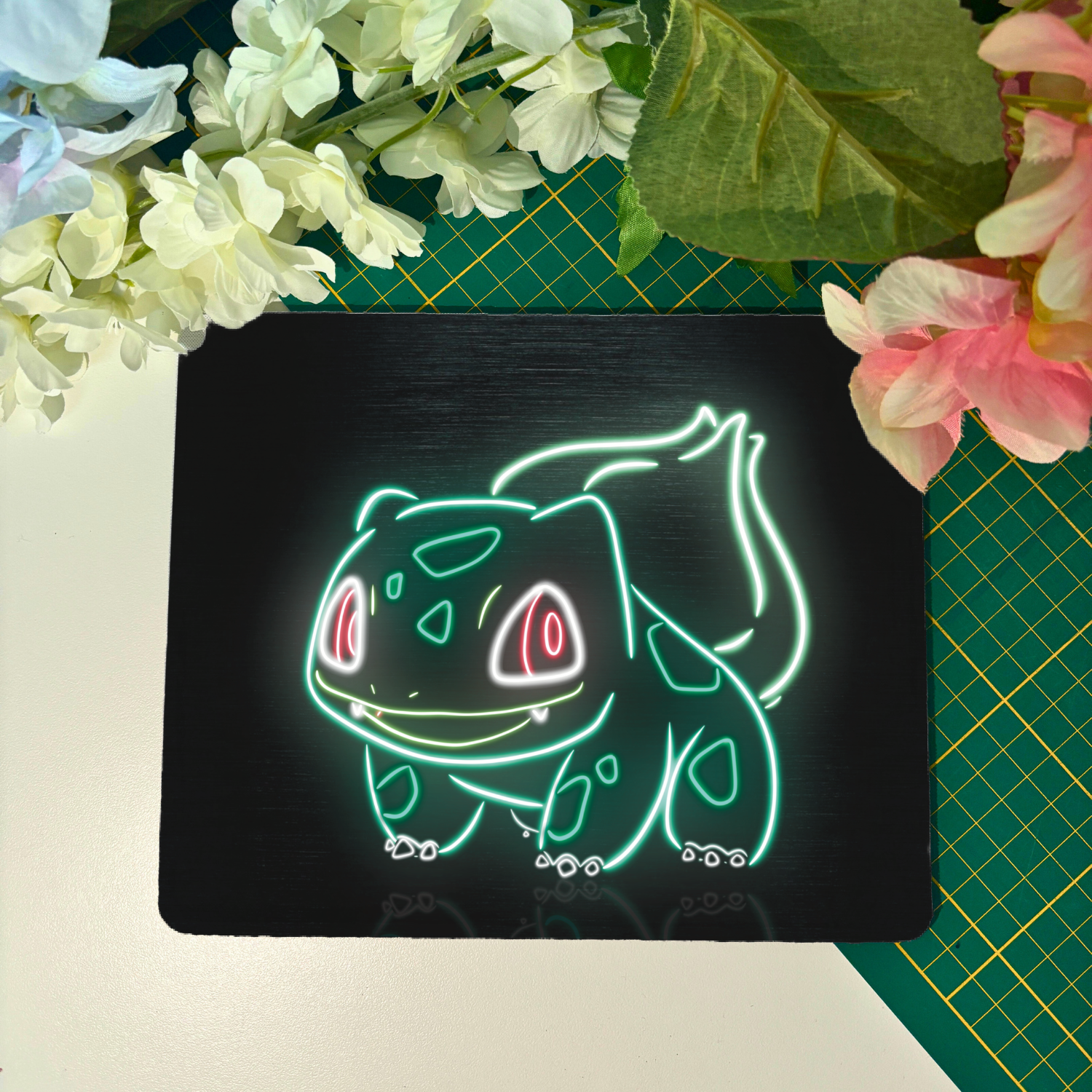 Wat is er nou fijner dan een muismat waar je graag naar kijkt? Dat gaat helemaal goed komen met deze Neon Bulbasaur muismat.